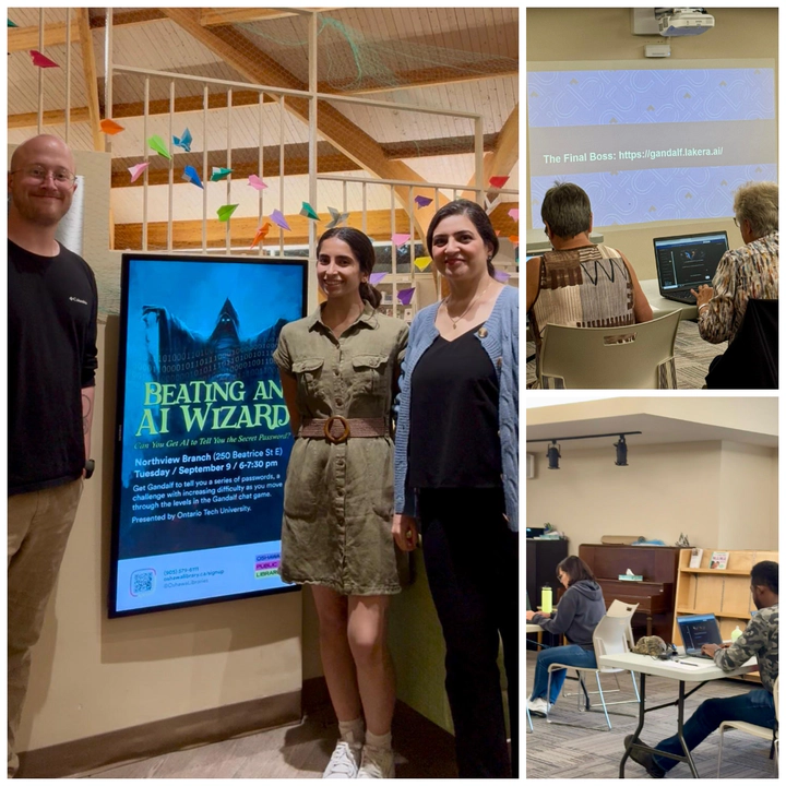 A selection of photos from the eventThis week, Nathan, Zahra, and Ainaz delivered a workshop entitled *Beating an AI Wizard: Can You Get AI to Tell You the Secret Password? for Oshawa Public Libraries.